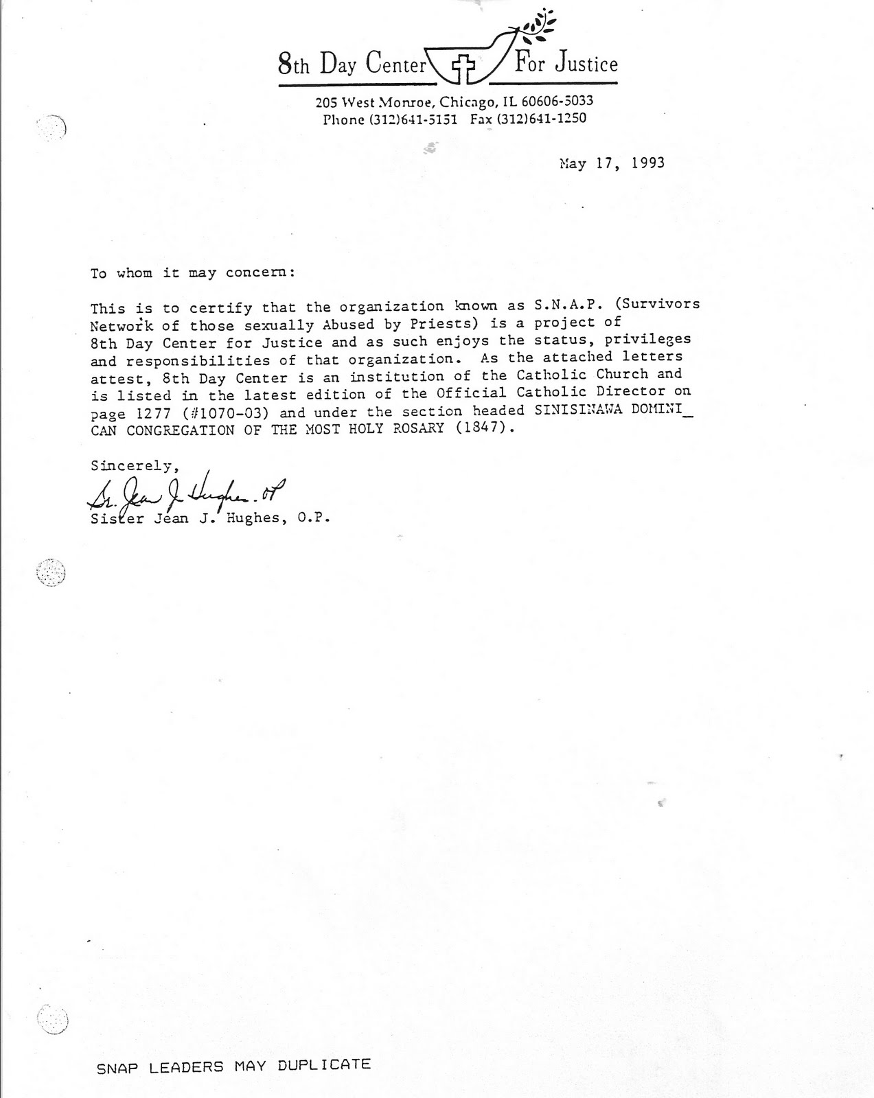 At this point I will say, again, that I don’t think SNAP is effective because its national leadership seems disconnected from the rest of us. The organization is not a network, despite its name. There is a vocal element out there that feels that the organization is an arm of the Catholic Church because of the way it is formed. They base this claim on the letter that follows: