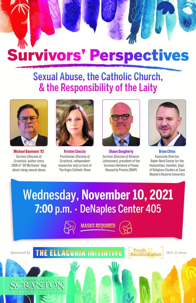 In the episode that will be available at noon on Saturday, 12 February, I was invited to come and discuss the Survivors’ Perspective panel discussion held at the University of Scranton in November 2020. I helped Dr. Teresa Grettano (Director of the Ellacuria Initiative) and Dr. Christian Krokus (Co-Chair of the Healing, Reconciliation and Hope Task Force 2018-2020) pull this event together. I was a panel member alongside Shaun Dougherty, the President of SNAP, Kristen Ciaccia from The Angry Catholic, and Professor Brian Cites from Case Western Reserve University. We also discussed other topics related to how survivors are treated by the Bishops and how survivors are not all the same.